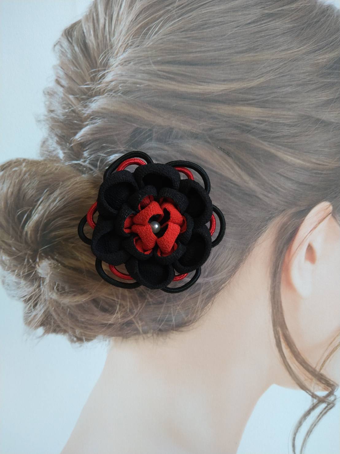 つまみ細工と飾り紐を組合わせ大ぶりなお花の髪飾り