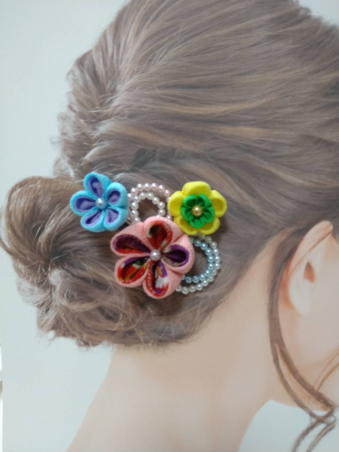 200年以上の歴史のあるつまみ細工をパステルカラーで古風になりすぎず可愛く仕上げました。複数の色を使っているので着物の色や柄に合わせてお楽しみいただけると思います。